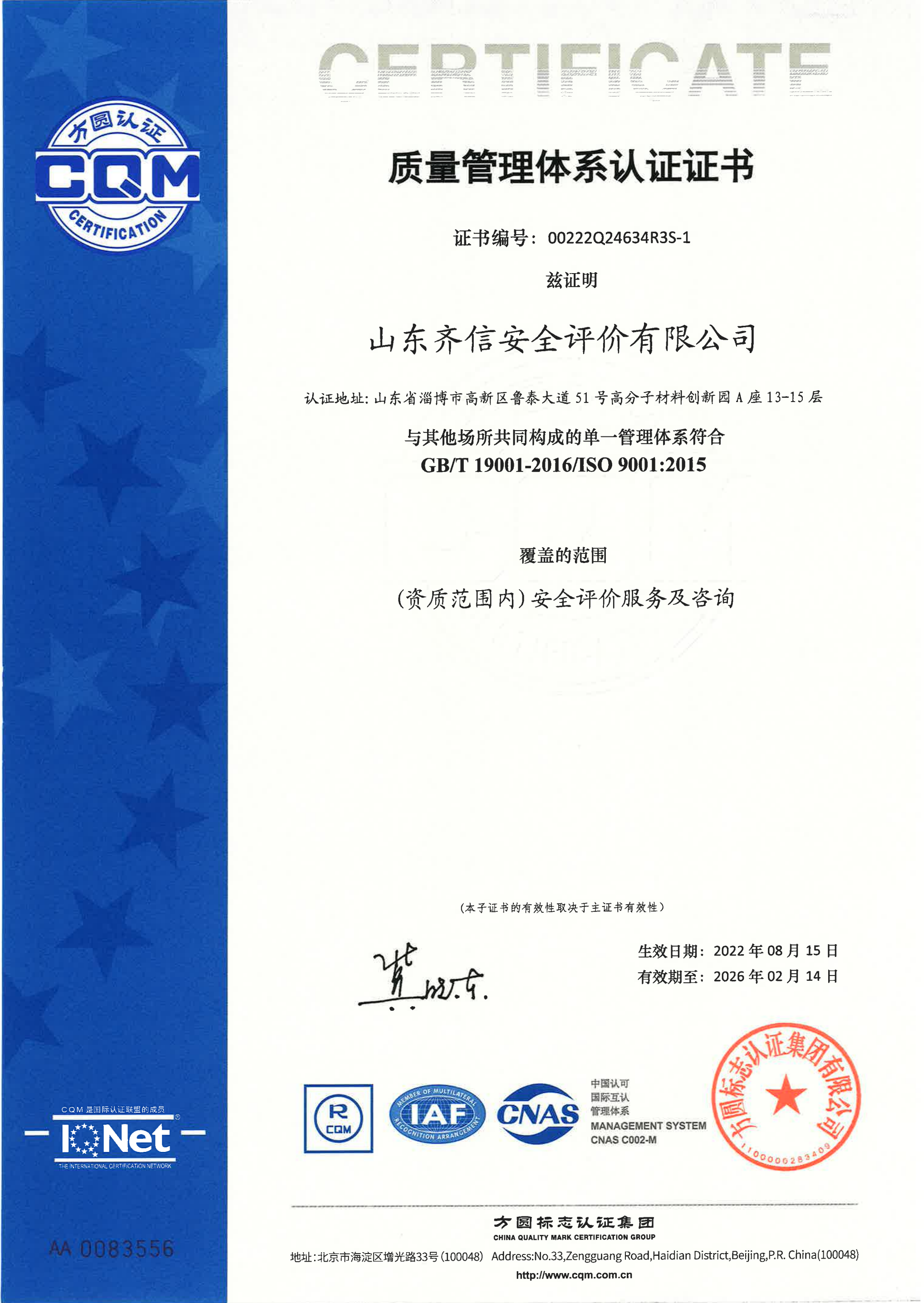 山東齊信安全評價有限公司成立于2005年3月,注冊資本300萬元人民幣,固定資產總值804.8728萬元。法定代表人徐光明,注冊地址及辦公地址位于淄博高新區魯泰大道51號高分子材料創新園A座13-15樓。2005年9月取得安全評價機構乙級資質。自國家應急部1號令實施以來,公司于2020年1月15日取得新安全評價資質,業務范圍包括:陸上油氣管道運輸業;石油加工業,化學原料、化學品及醫藥制造業;金屬冶煉。2018年12月21日取得安全生產標準化二級評審單位,評審范圍:危險化學品、紡織、建材、輕工、冶金、機械。              公司現有人員41人,其中專職安全評價師37人,注冊安全工程師26人,研究員1人、碩士5人、雙學士1人,山東省安全專家庫專家1人、教授級高工1人,高級工程師8人、工程師22人,專職危險化學品標準化評審員、工商貿標準化評審員30人,本科以上學